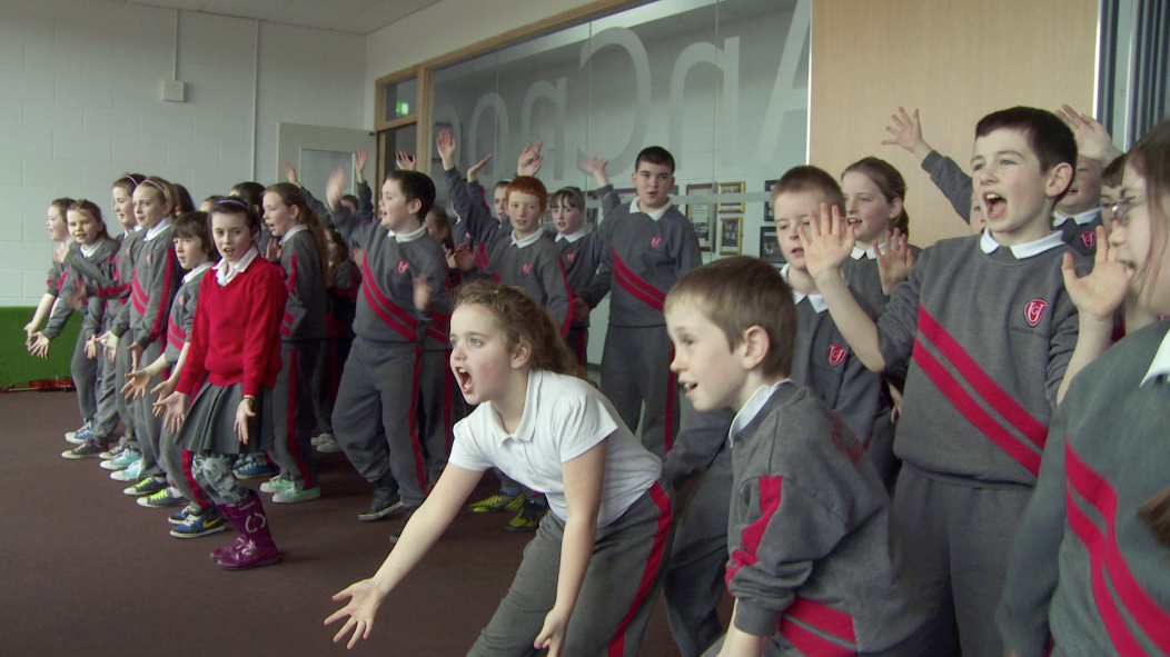 In the series, teachers and kids adapt stories, often fairytales and add into the mix Irish language adaptations of popular songs. This is often done with a great degree of humour and the kids love it. To give you an example heres a piece of audio from ‘Gillin Sneachta’ by the kids in Gaelscoil Ultain as they are put through their pace by Muinteoir’s Niamh and Joe